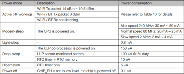 As an example, the ESP32, a popular MCU, provides a table in its datasheet that shows various sleep modes and their power consumption in those modes. Looking at these tables (see Figures 1 and 2 below), it’s seen that a maximum of 240 mA can be reduced to 5 µA by changing the power mode, a ~48,000-fold difference.