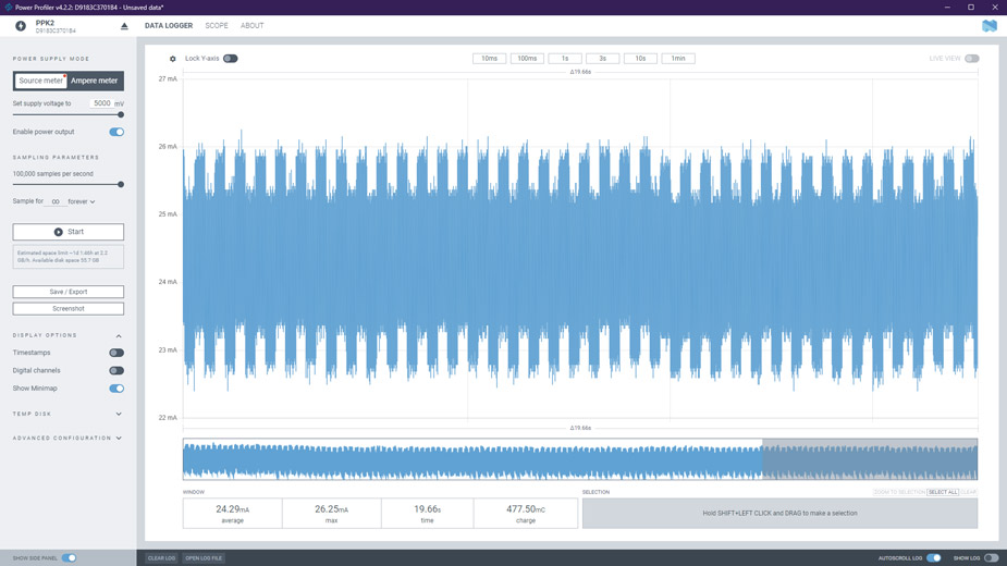Figure 3 shows an average power draw of 24.3 mA in the 20s window, while the low-power version shown in Figure 4 has an average draw of 13.4 mA, nearly half the current used. These numbers can mean very little without some context. If the system were powered by a single CR2032 3V coin cell battery with a capacity of 225 mAh, the runtime would range from 225 mAh / 24.3 mA = 9.25 h to 16.8 h.